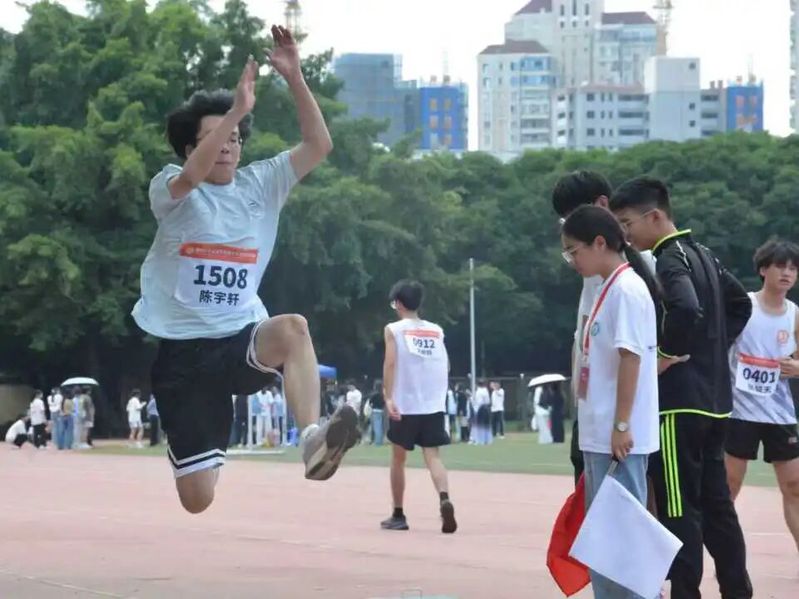 飞跃沙坑,陈宇轩似离弦之箭,蓄满力量,一跃而起,划破长空。用飞跃诠释青春的激情与无畏,取得男子跳远组第五名。