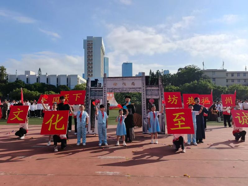 “家国天下,坊巷福州”的号声里,藏着少年们与孩童们的共振。当南后街的坊巷牌楼在场地间立起,大朋友与小朋友的笑靥和古厝纹样相映成趣,展现了人文艺术系青年学子对文化传承的热忱。