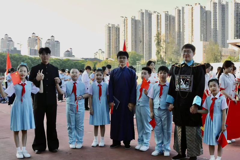 伴随着进行曲的奏响,人文艺术系方阵迈着矫健的步伐进入会场,同学们身着民族服饰,脸上洋溢着灿烂的笑容,与特邀而来的小学生们一同开启了文脉传承的鲜活篇章。