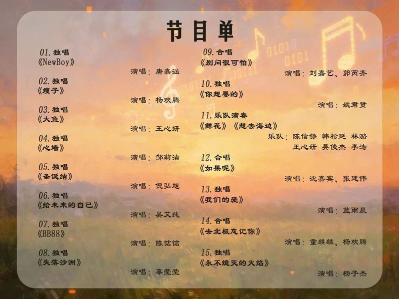 本次活动旨在打破院系壁垒,传递青春温暖,凝聚两系学子情谊,为大家搭建多元交流、尽情展示的舞台,以音乐交织科技与艺术的魅力,营造温馨向上的校园氛围。让我们共赴这场星光与欢笑相伴的跨界盛宴,在协作与欢歌中绽放青春光彩,一起书写校园文化的崭新篇章!