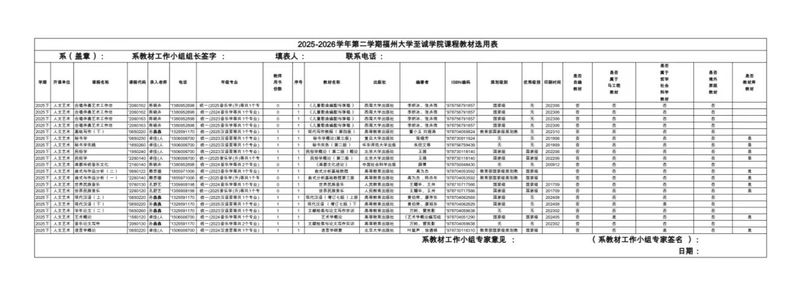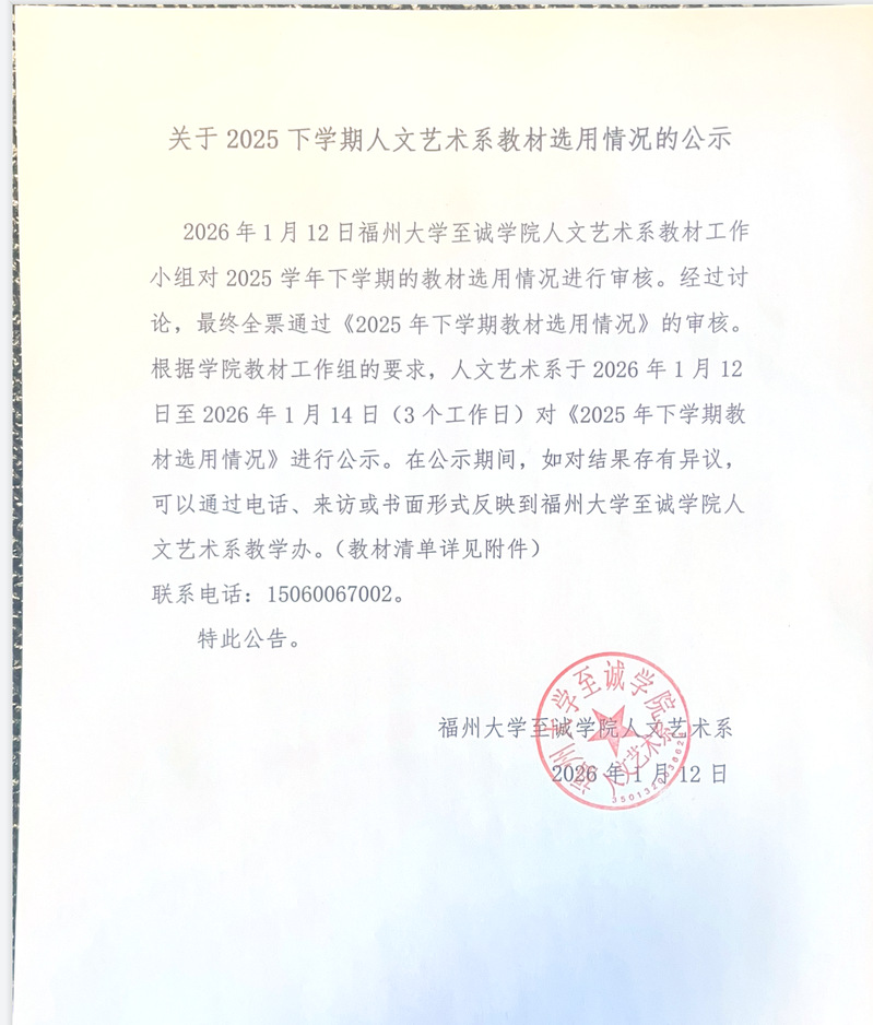 2026年1月12日福州大学至诚学院人文艺术系教材工作小组对2025学年下学期的教材选用情况进行审核。经过讨论,最终全票通过《2025年下学期教材选用情况》的审核。根据学院教材工作组的要求,人文艺术系于2026年1月12日至2026年1月14日(3个工作日)对《2025年下学期教材选用情况》进行公示。在公示期间,如对结果存有异议,可以通过电话、来访或书面形式反映到福州大学至诚学院人文艺术系教学办。(教材清单详见附件)