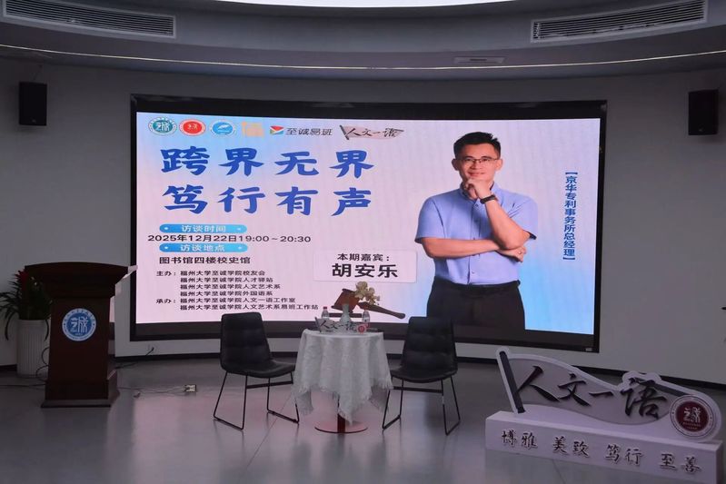为搭建在校学生与杰出校友的交流平台,发挥校友榜样示范引领作用,助力在校生明晰成长方向、增强发展信心,12月12日晚,人文艺术系在福州大学至诚学院顺利举办了第七期“人文一语”校友访谈系列活动。第二党总支书记陈文福,人文艺术系党总支书记林筠颖,团委书记肖丽,系辅导员杨庆、张婧作为嘉宾出席本次活动。2008届英语专业优秀校友胡安乐学长作为主讲嘉宾,为我们带来了他从英语专业走向专利密林,守护创新火种的故事。
