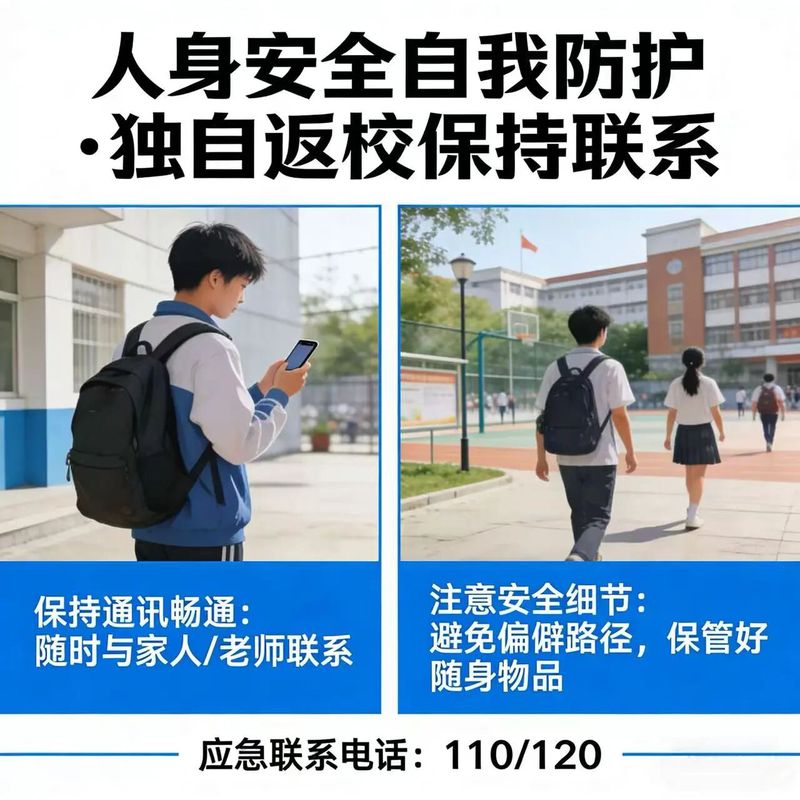 独自返校的同学,应与家人、朋友保持实时联系,及时分享行程动态和所在位置,提前告知预计到达时间。遇到突发情况,第一时间向亲友或辅导员求助。