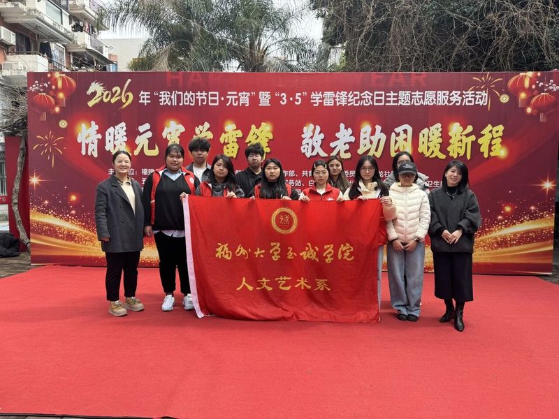 为传承弘扬中华优秀传统文化,践行雷锋精神与志愿服务理念,深化校地协同育人实践,3月4日,福州大学至诚学院人文艺术系携手福州市鼓楼区五凤街道白龙社区,在双拥广场协办2026年“我们的节日·元宵节”主题志愿服务活动。本次活动以“情暖元宵学雷锋 敬老助困暖新程”为核心,融合节日文化、文艺展演与便民服务,聚焦社区居家养老群体、新就业形态劳动者等群体需求,人文艺术系师生志愿者以专业所长与暖心行动,为社区增添浓浓暖意,让雷锋精神在春日里熠熠生辉。