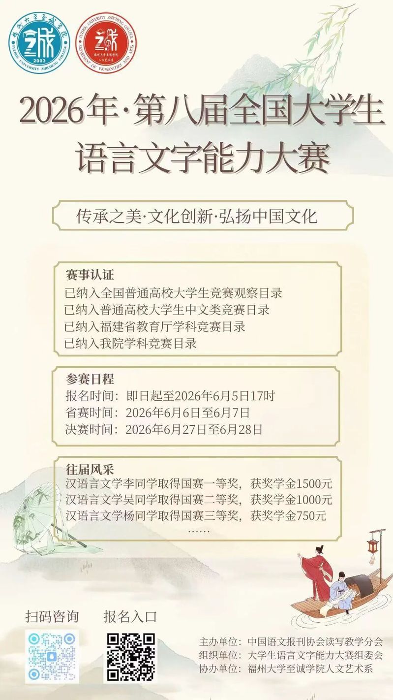 为深入贯彻国家语言文字工作方针政策,全面提升大学生语言文字应用能力与综合人文素养,由中国语文报刊协会读写教学分会主办、福州大学至诚学院人文艺术系协办的2026年第八届全国大学生语言文字能力大赛即将开赛。我们诚挚邀请广大同学踊跃报名、积极参与,在赛事中展现语言风采,锤炼文字功底!