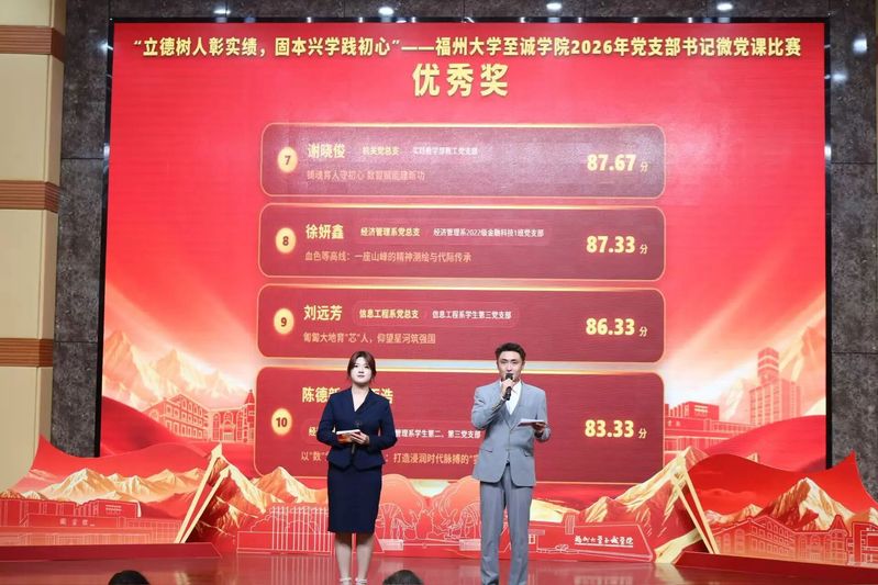 3月31日,由中共福州大学至诚学院主办、党委组织部(党校)、人文艺术系党总支承办的“立德树人彰实绩,固本兴学践初心”微党课大赛在科报厅隆重举行。福州大学马克思主义学院王剑龙老师、组织部组织科吴雨桐老师、金山学院党工部负责人,马克思主义学院党总支书记李佳曦老师担任大赛评委,福州大学至诚学院党委常务副书记何小红、各机关部(处),各党总支负责人应邀出席。